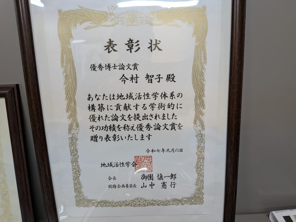 今村さんは地域活性化センター等、東京で開催されるセミナーに熱心に通う市役所職員でした。私が60代で博士号を取ると、「私も博士になりたい」と即座に手を挙げられました。私は地域活性学会を紹介し、論文の書き方講座を開催したり、実務家が研究者になるお手伝いをしました。その後、今村さんは金沢大学の大学院で博士論文を執筆し博士号を取得します。ただ市役所職員としての両立が難しく、市役所を退職しての博士号挑戦となりました。その後、金沢星稜大学の大学教員となったわけです。今村研究室には地域活性学会から授与された「優秀博士論文賞」が輝いていました。金沢市中心市街地における大学生の活動を支えており、福井県や白山市で委員会委員に就任するなど活躍しています。これから北陸地方の地域づくりに大いに貢献して欲しいと思いました(斉藤)。