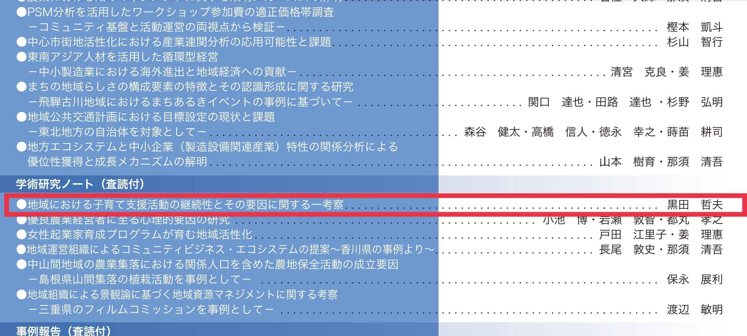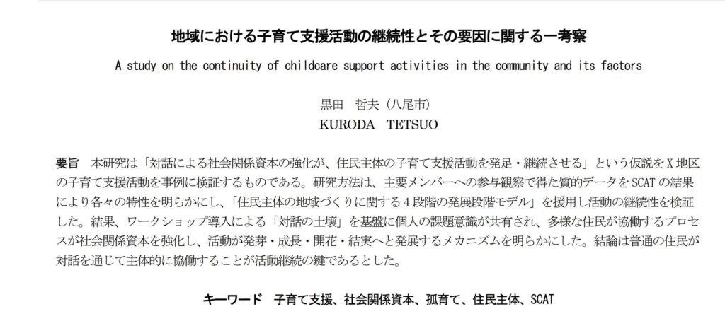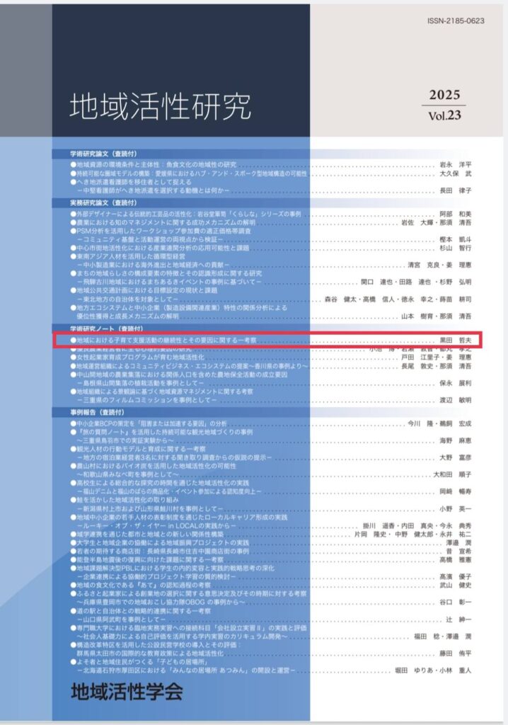 八尾市で地域住民の方々と一緒に取り組んだ子育て支援活動の発足から継続に至るダイナミズムを分析したものですご協力いただいた地域の皆さんに報告したいと思います。掲載されている自治体職員は、僕だけ…地域活性化の最前線にいるのは自治体職員ではないのだろうか?自治体職員には、もっと投稿してほしいです。現在、地域活性研究vol.24にも投稿しており、査読中で、研究内容は「オオサカポテト」さんを題材にしています。この先、vol.25はコミュニティナース、vol.26は公益信託に関して研究する予定です。研究したいことがいっぱいあります!!!