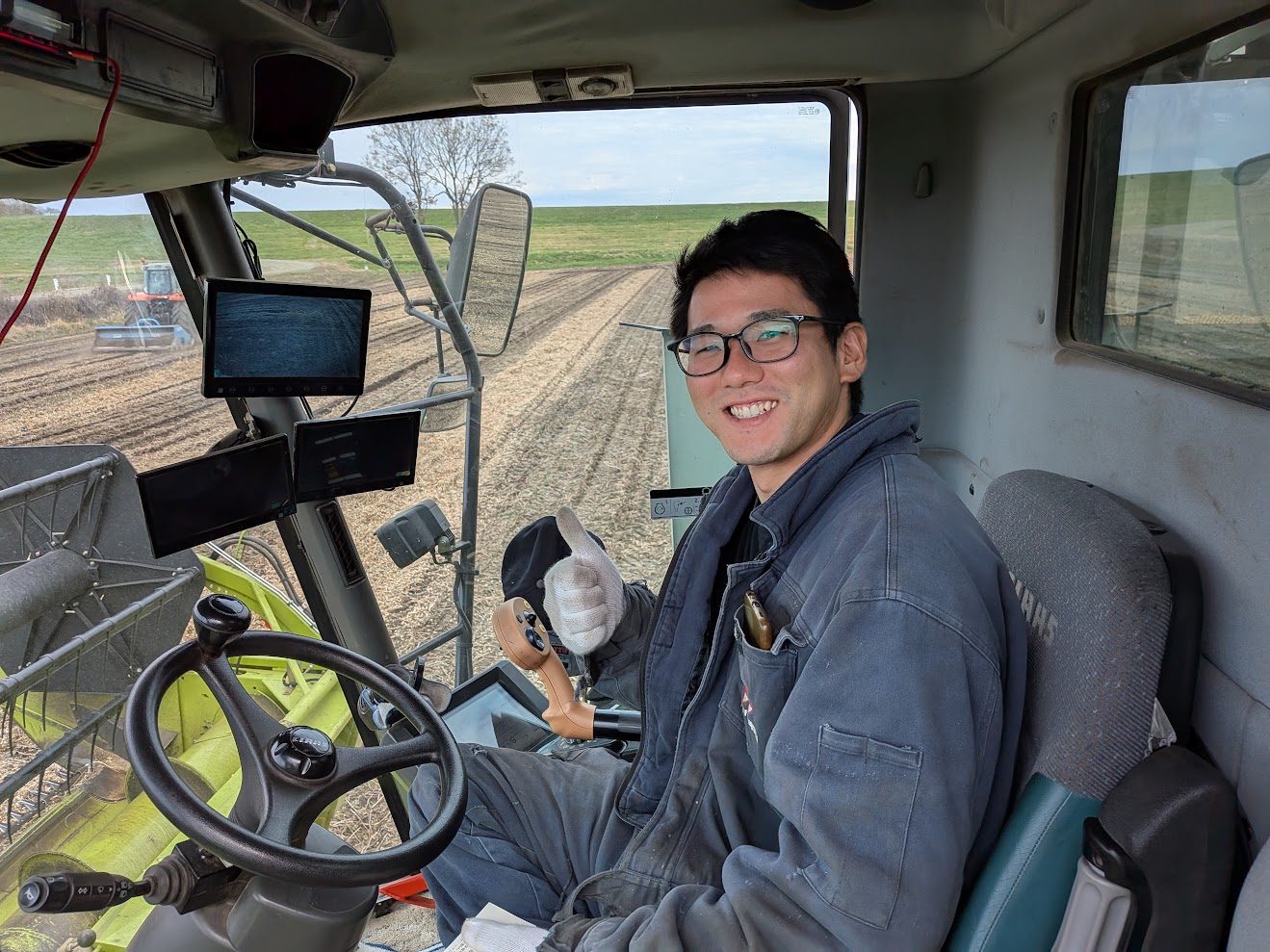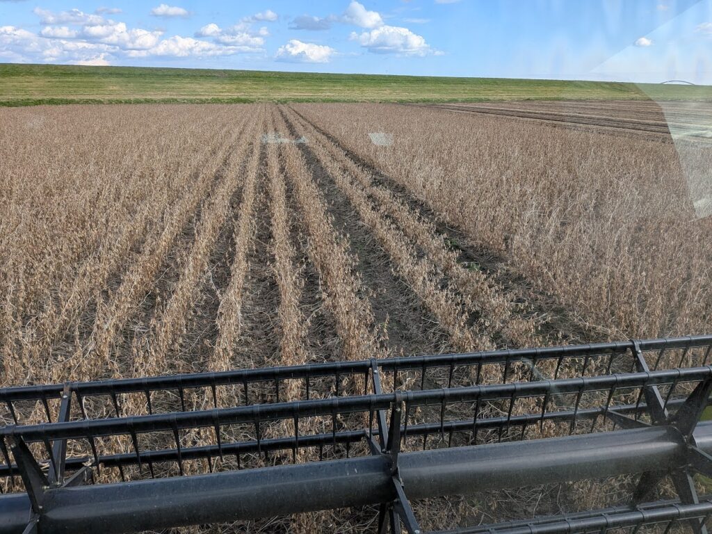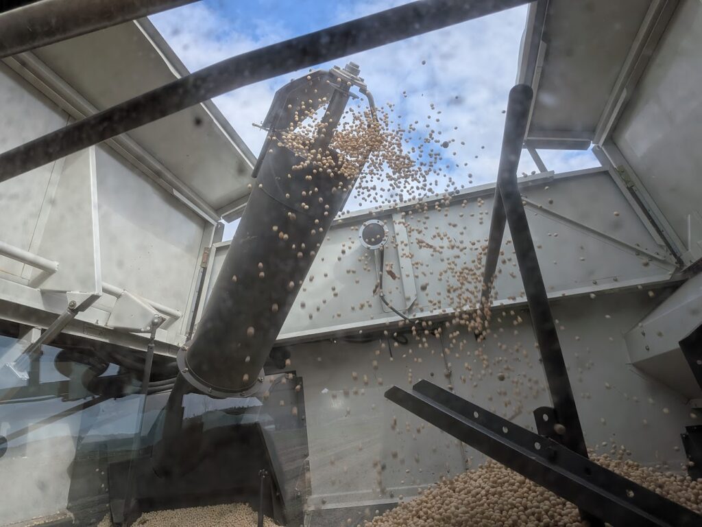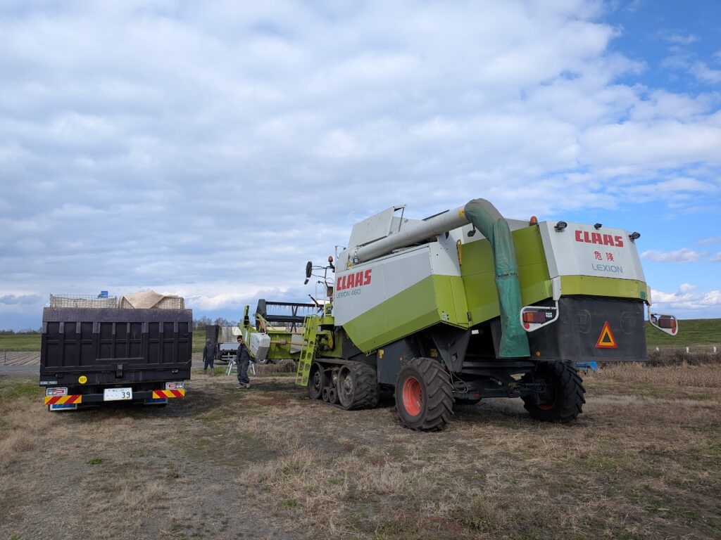 1億円はする大型コンバインは大豆畑4ヘクタールをわずか1時間で刈り取る
