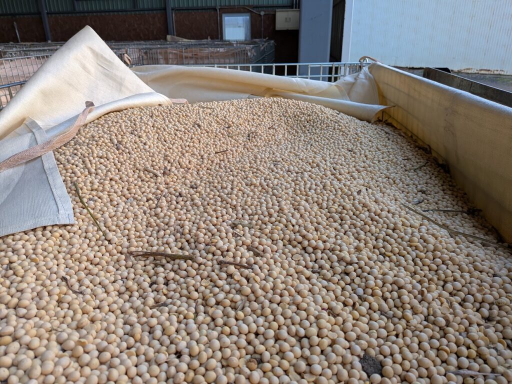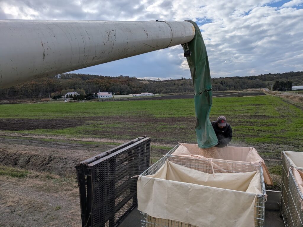 大型コンバインで大豆を収穫し、メッシュコンテナ(容量1000kg)の中にあるフレコンバックに大豆を投入。このままJR貨物で鉄道がつながる食品工場へと運ばれます。JAを通した契約栽培。ジャガイモだと京都府にある貨物線路際にあるポテトチップ工場に横付けされ搬入されるのを見たことがあります。大豆は味噌や醤油、納豆や豆腐になり、これも埼玉県や京都府にある工場に横付けされるのでしょう。大都市の食を支える生命線。JAの集荷拠点に大豆は集められ、石抜きしてJR貨物にそのまま投入されるのか。JAは土地利用型農業で大きな役割を果たしています。