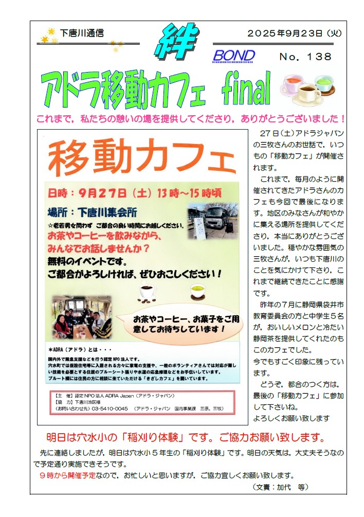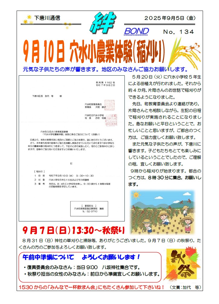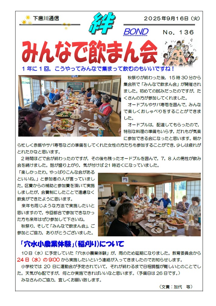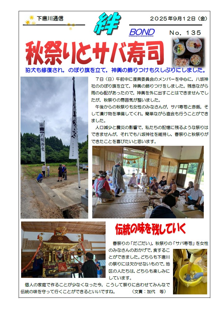 26日(火)に金沢美大の宮永先生を中心にしたワークショップが開催されました。丸山のあすなろファームで染色わらを使った俵編みが学生さんを中心に行われました。左部さんが俵編みを,そして吉岡さんがサンドラ作りを指導してくれました。学生さんにとっては初めての体験でしたが,楽しみながら取り組んでいたとのことでした。さすが美大生,色合いがとても素敵で,出来上がりを見た時には,感動しました。磐持大会の時に披露するのが楽しみです。本当にありがとうございました。そして,神社では宮永先生を中心に,壊れてばらばらになった狛犬の修復が行われました。壊れたパーツを丁寧に接着しながら,だんだん元の姿になっていきました。午前中で,ほぼ壊れた部分の接着が終わりました。私は,その後,圃場整備の講習会があったため,神社を離れたのですが,講習会が終わり急いで神社に戻ると,そこにはパテでひび割れを埋め,きれいに色付けがされた狛犬の姿がありました。今まで気にも留めなかった狛犬ですが,修復された狛犬を見るととても愛らしい顔をしていて,これまで以上に愛着がわきました。本当に素晴らしい出来で,感動しました。7日のお祭りの時に皆さんにご披露したいと思います。ありがとうございました。
