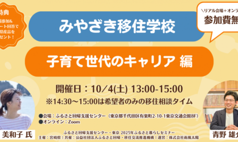 ふるさと回帰センター(東京交通会館) みやざき移住学校(子育て世代のキャリア編) 「家族との時間をもっと大切にしたい」「子育てと仕事を両立できる環境を探したい」—— そんな子育て世代に向けて、宮崎県が主催する移住セミナー…